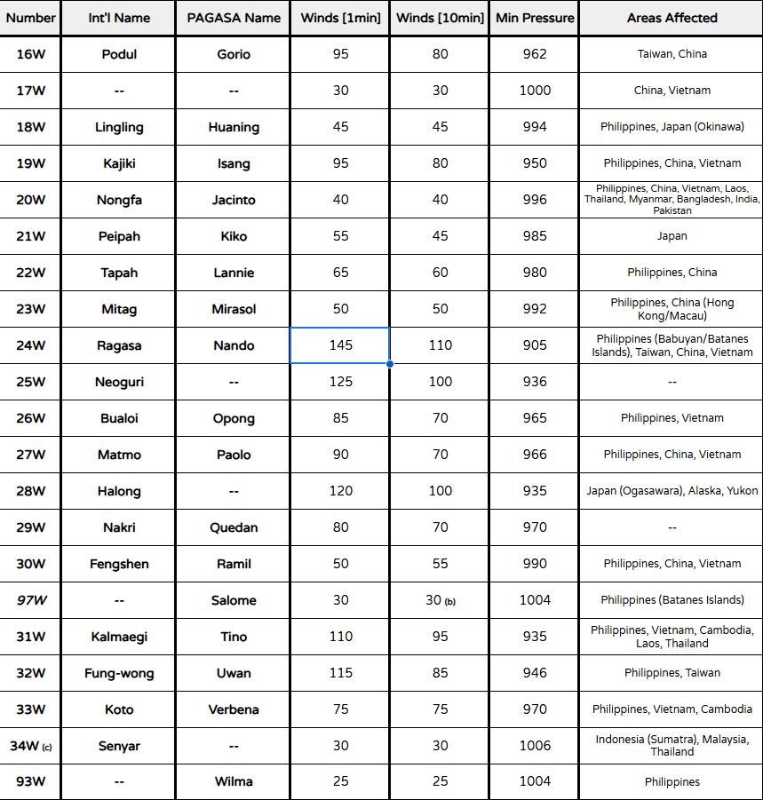 (b) Salome was operationally classified as a tropical storm by PAGASA but downgraded to a 30 kt tropical depression in post-storm analysis.