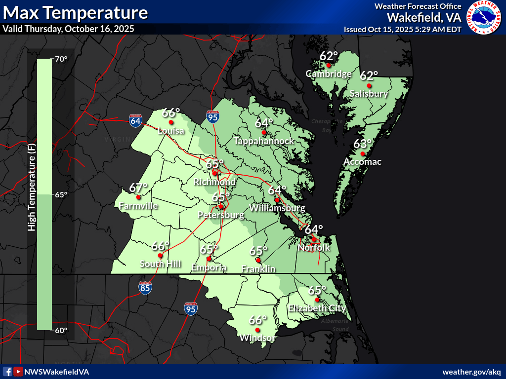 National Weather Service high temperature forecast for Thursday 10/16. Highs generally in the low to mid 60s across the whole area, with low 60s on the Eastern Shore.