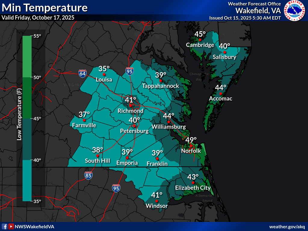 National Weather Service low temperature forecast for Friday 10/17. Lows are in the upper 30s to around 40 across much of the Richmond-Petersburg area, with temperatures in the low to mid 30s out west. Lows are warmer near the coast.
