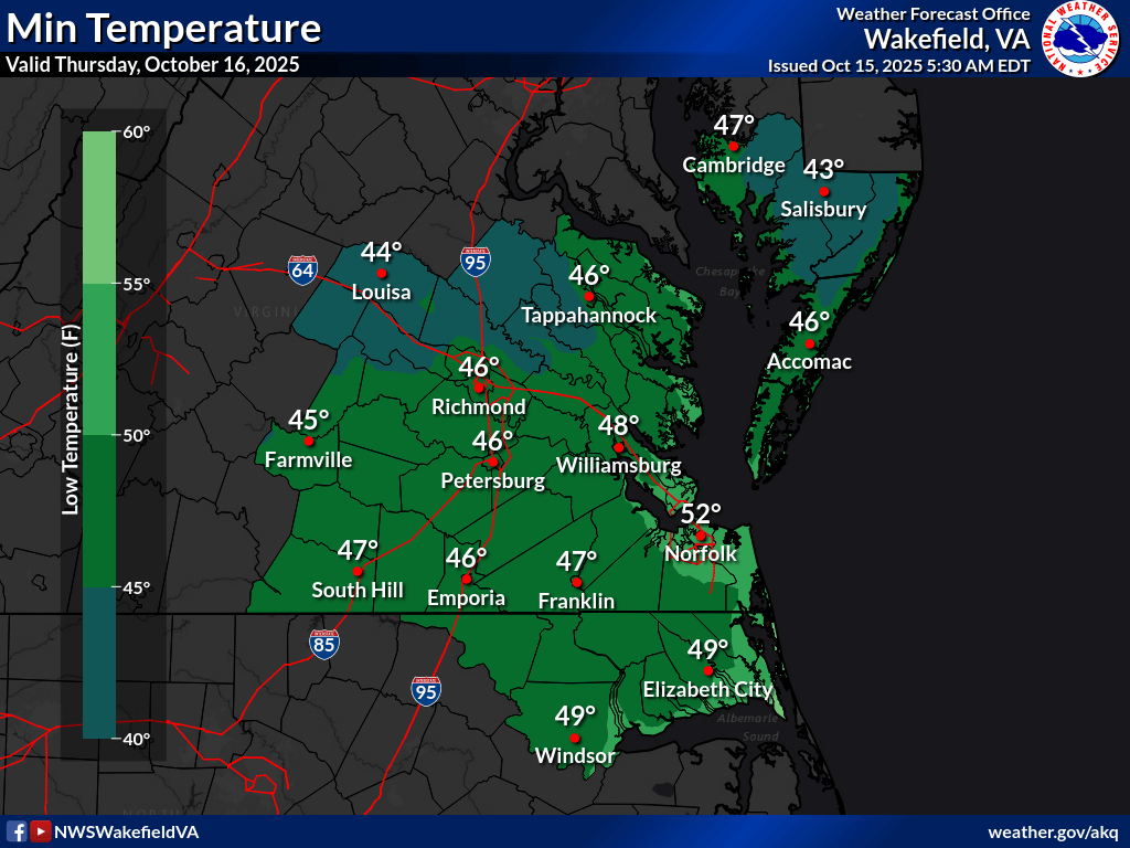 National Weather Service low temperature forecast for Thursday 10/16. Lows in the mid to upper 40s across the area, with low 40s to the north and west of Richmond.