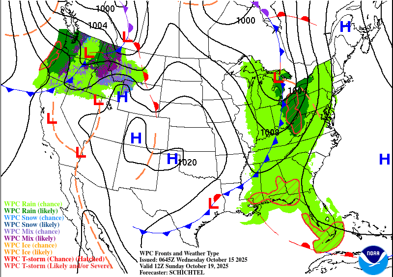 Weather Prediction Center weather map for Sunday 10/19. Much of the eastern United States could see unsettled weather as a strong cold front approaches the area.