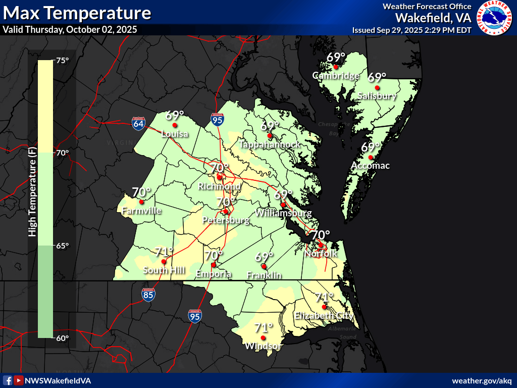 National Weather Service high temperature forecast for Thursday 10/2. Highs around 70 across the entire area.