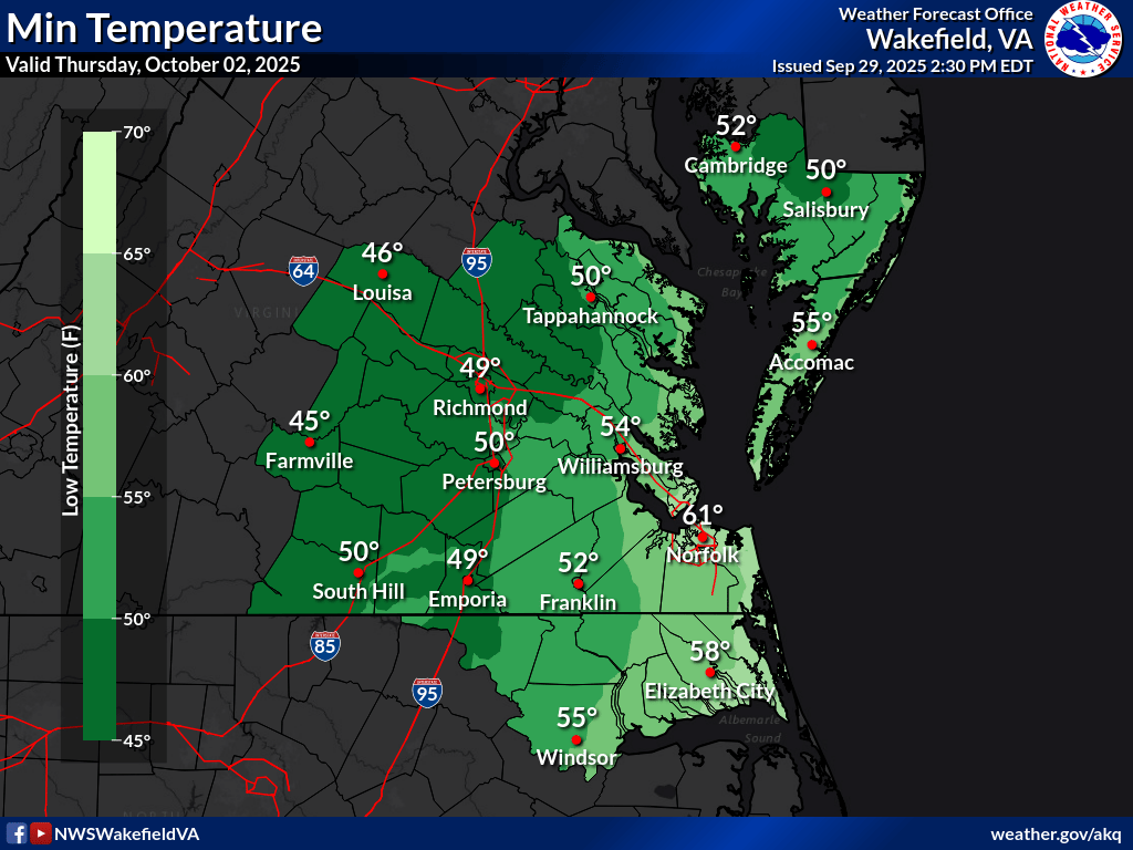 National Weather Service low temperature forecast for Thursday 10/2. Low temperatures in the mid to upper 40s across the area, warmer near the beaches.