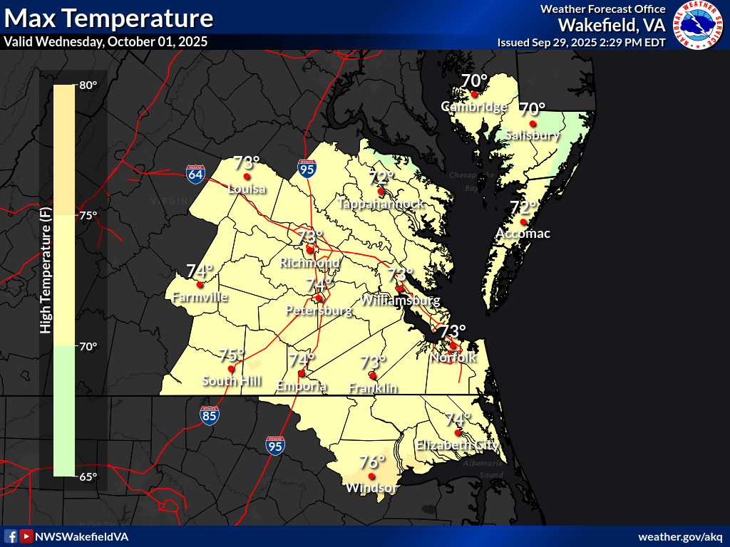 National Weather Service high temperature forecast for Wednesday 10/1. Highs in the low 70s across the entire area.