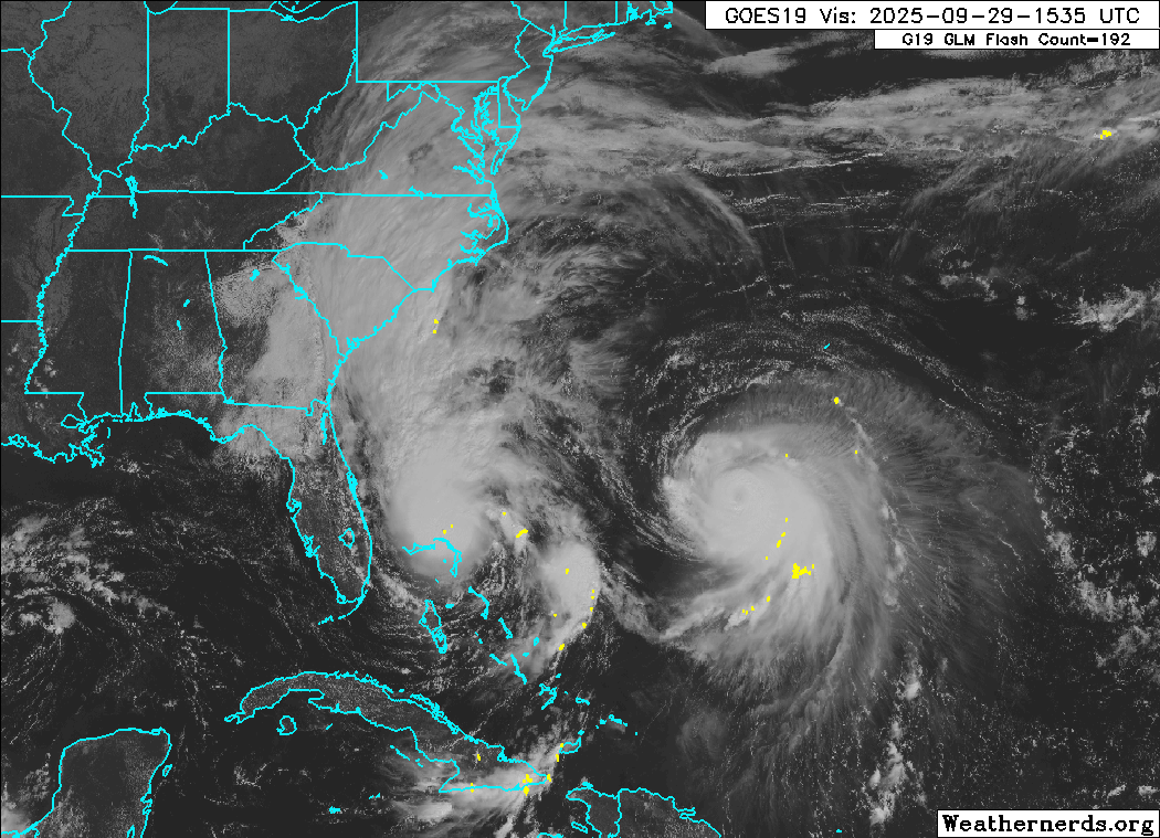 GOES-19 visible satellite loop of the western Atlantic, centered upon Tropical Storm Imelda north of the northern Bahamas and Hurricane Humberto southwest of the Bahamas.