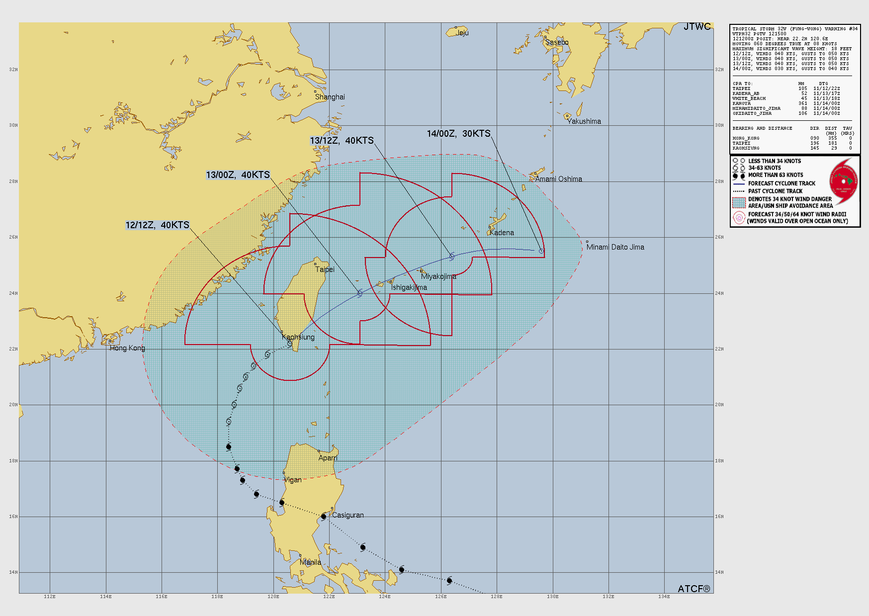 000 hrs: 22.2°N 120.6°E – 40 kts 75 km/h