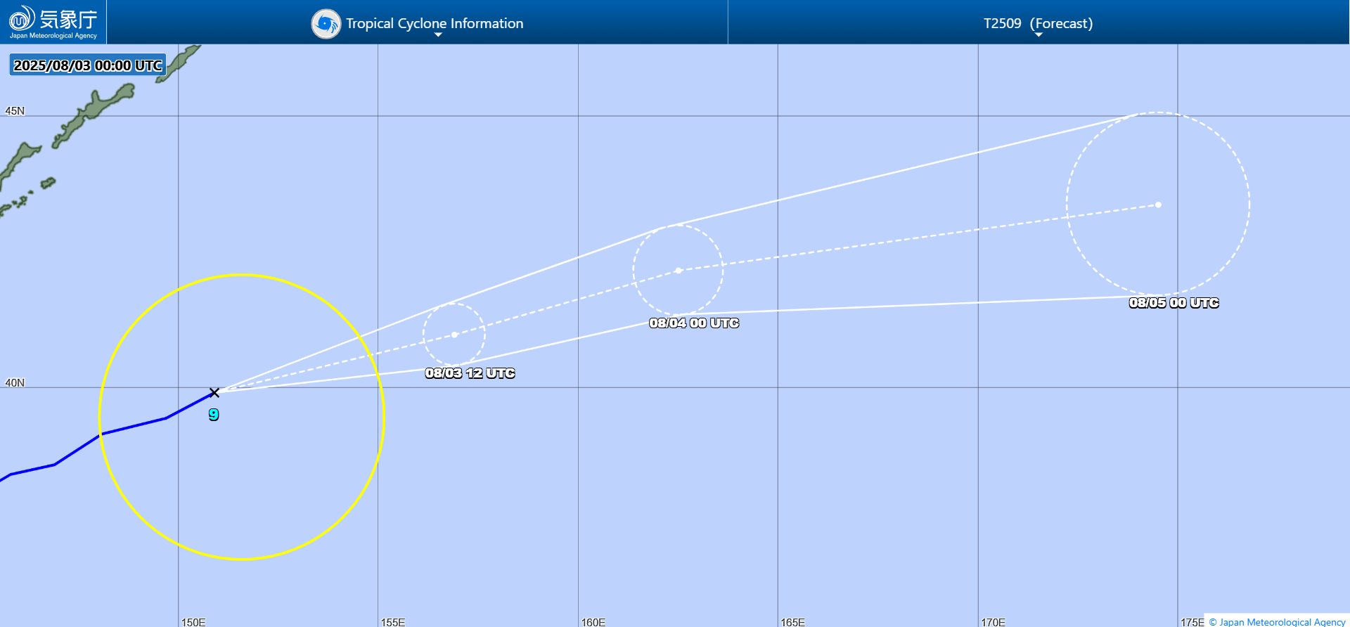 24 hrs: 42.2°N 162.5°E – 45 kts Post-tropical/extratropical