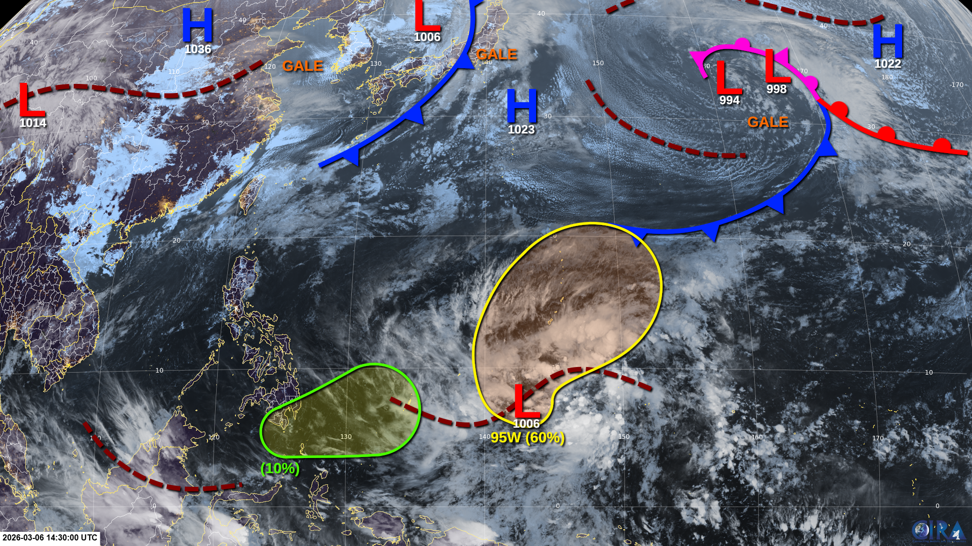 Invest 95W (south-southwest of Guam): A large and sprawling area of disturbed weather located south-southwest of Guam and southeast of Yap is associated with a very broad, monsoon-like area of low pressure. Although the low's associated shower activity is not particularly well organized, scatterometer data indicates that the low's circulation is gradually becoming better defined, although its associated winds are only about 15 to 20 knots. Environmental conditions are currently marginally conducive for development, and a short-lived tropical depression could form over the weekend as the system moves slowly and erratically north-northwestward, then turns northeastward and passes close to Guam and the Northern Mariana Islands. By the middle of next week, strong upper-level winds and very dry air should end any development chances. Interests in Guam and the Northern Mariana Islands should monitor the progress of this system as it could produce heavy rainfall and isolated flooding during the next few days.