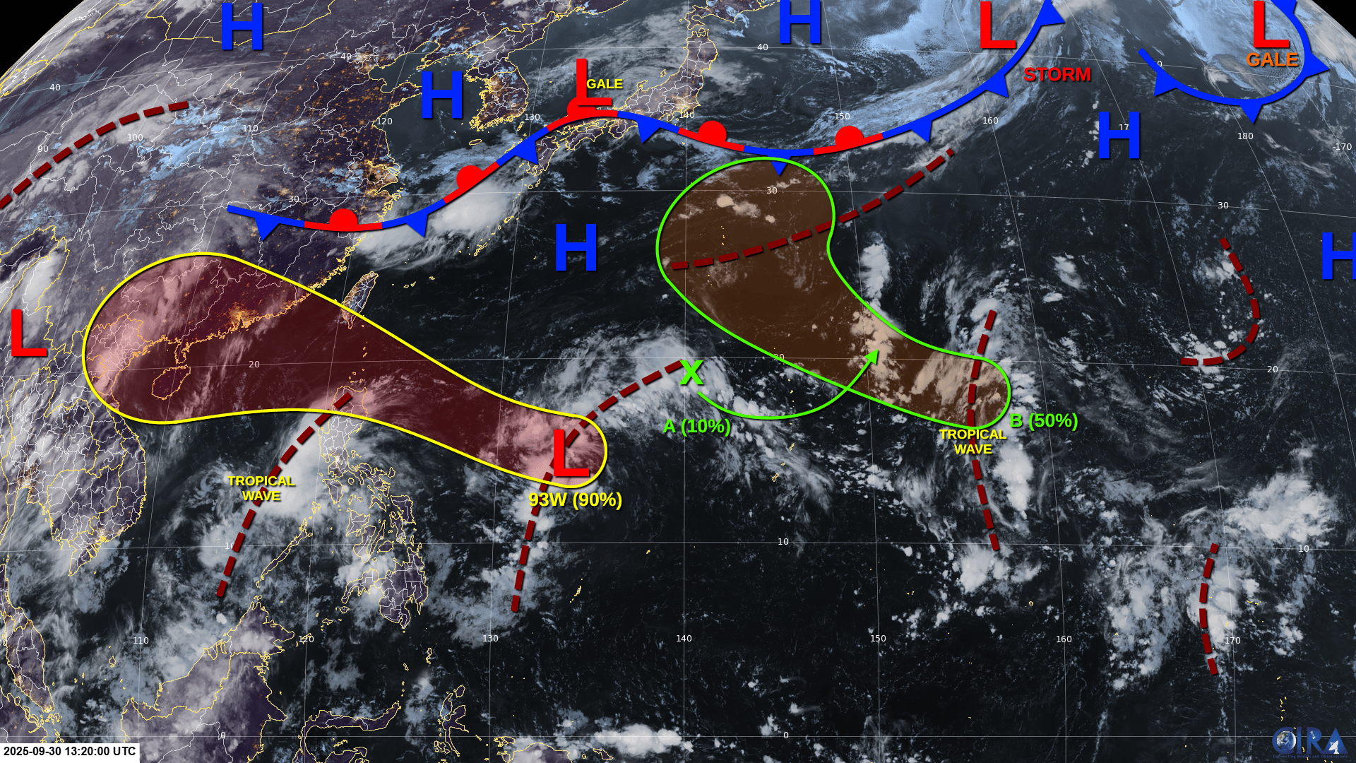 Disturbance A (northwest of the Marianas): A weak area of low pressure is likely to form along a surface trough northwest of the Marianas by the end of the week. Some limited development of this system is possible before it merges with another developing system over the weekend.